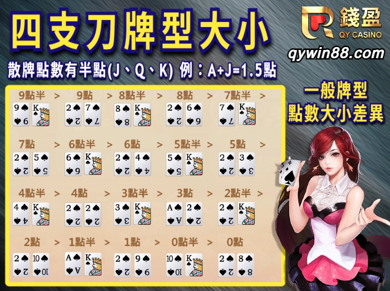 了解了四支刀規則後與發牌流程後,接下來就是要了解四支刀牌型囉!這邊簡單為大家介紹一下四支刀點數如何計算。撲克牌Ace代表1點,撲克牌2到9則都是依照撲克牌上的點數計算,10則是0點,人頭J、Q、K則是半點,那如果沒有組成特殊牌型的話就都是以兩張撲克牌點數相加,並且只取個位數為主,不看花色,單純比點數大小!